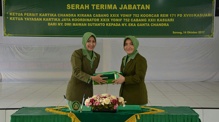 Sorong – Ketua Persit KCK Koorcabrem 171 Ny. Natalia Yogo Triyono, memimpin acara serah terima jabatan Ketua Persit Kartika Chandra Kirana Cabang XXIX Yonif 752 dari Ny.Dwi Mawan Sutanto Kepada Ny. Eka Ganta Chandra dihadiri oleh Wakil Ketua Persit KCK Koorcabrem 171 Ny. Dian Sundiana pengurus Persit KCK Koorcabrem 171, para Ketua Persit KCK Cabang dan anak Ranting bertempat di Aula Palapa KCK Yonif 752 Jln. Basuki Rahmat KM. 10 Kelurahan Klawalu Distrik Sorong Timur Kota Sorong-Papua Barat, Sabtu (14/10).