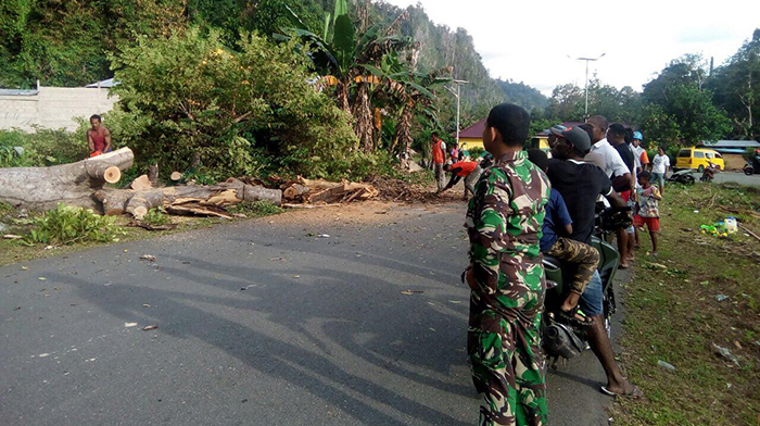 Proses efakuasi pohon dari ruas jalanp dilakukan secara bergotongroyong serta semangat dari warga setempat demi kelancaran arus lalulintas sehingga para pengguna jalan tidak terhambat dengan adanya pohon yang menghalangi jalan.