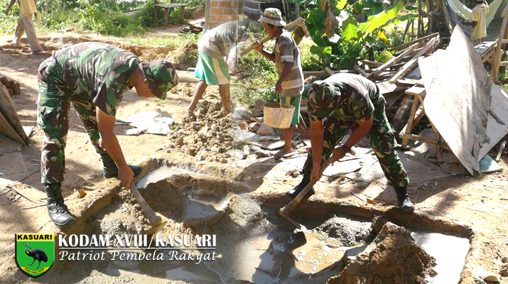 Sorong – Sersan Satu Ibnu Sabtoro yang bertugas sebagai Babinsa dari Koramil 1704-01/Sorong Timur membantu pembangunan rumah Bapak Ali, warga Kampung Sawagumu, Kabupaten Sorong, Senin (22/04/17).