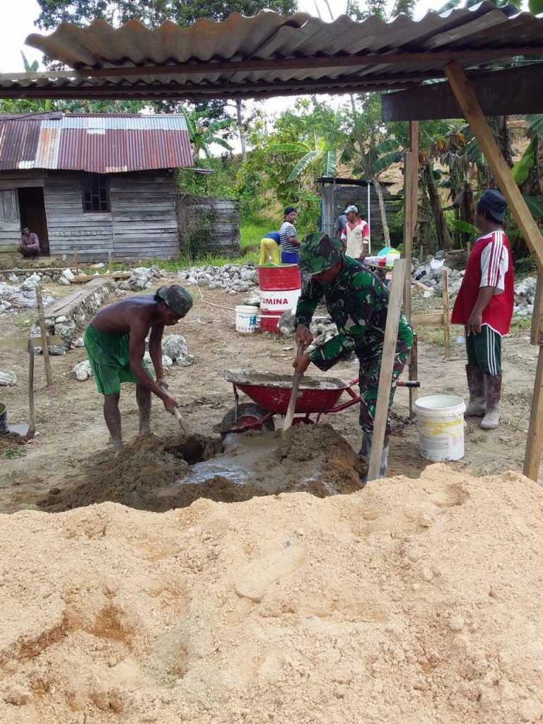 Untuk mewujudkan semuanya itu, Babinsa Kampung Maklalut Koramil 1802-01/Sorong Timur Sertu Saptanto melaksanakan gotong royong bersama warga membangun pondasi rumah milik Bapak Yanto yang merupakan warga binaannya.
