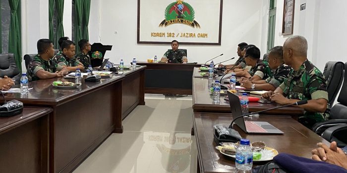 Danrem 182/Jazira Onim, Kolonel Inf Aswin Kartawijaya sampaikan Kepada Para Komandan Satuan TNI di Fakfak dari Korem 182/JO, Kodim 1803/Fakfak yang dihadiri Dandim 1803/Fakfak, Letkol Inf Lukman Permana dan Komandan Lanal Fakfak, Mayor Laut (P) Haslul Prio Widiatmoko, Serta Para Kasi dan Perwira Korem 182/JO, di Ruang Rapat Perwira, di Makorem 182/JO, Distrik Fakfak Barat, (Selasa,24/9/2024)