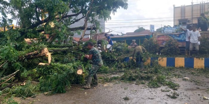 Aimas.- Pasca terjadinya hujan lebat yang disertai angin kencang mengakibatkan pohon tumbang hingga mengganggu pengemudi jalan. Babinsa Koramil 1802-07/Aimas Serka Darto bersama Pemerintah daerah kabupaten sorong dan masyarakat setempat membersihkan dan pemotongan pohon tumbang Di jl poros sorong klamono km 19. Kabupaten Sorong Provinsi Papua Barat Daya. Kamis (23/01/2025).