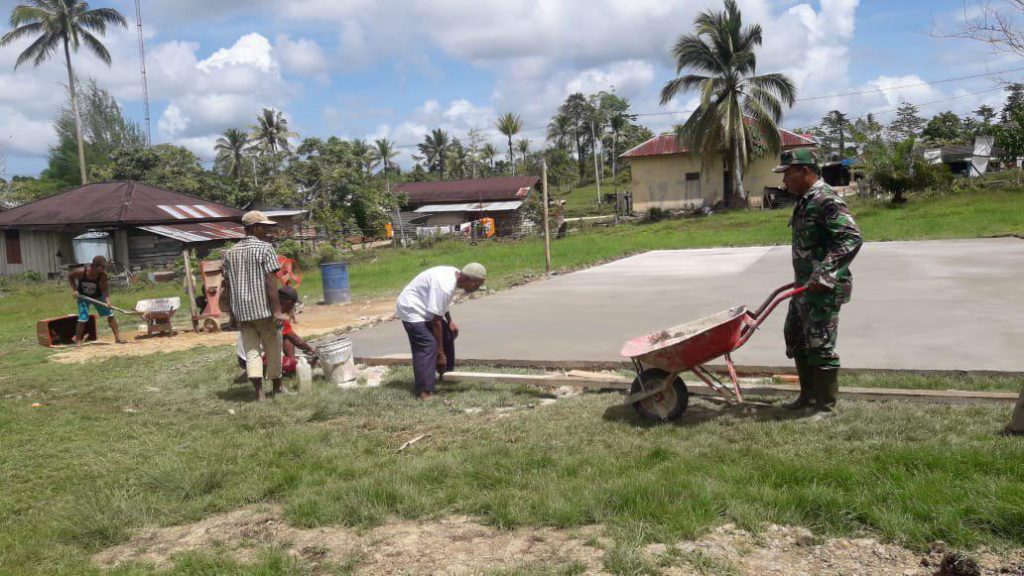 Sorong-  Babinsa Kampung klafdalim Koramil 1802-03/Salawati Serda Karmuji melaksanakan Kerja Bhakti membantu warga untuk pengecoran lapangan bola voly bersama masyarakat Kampung Klafdalim Distrik Moisegen Kabupaten Sorong, Rabu (13/02/2019).