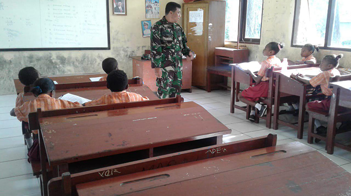 Sorong, -Babinsa jajaran Kodim 1704/Sorong tak kenal lelah melakukan pendampingan di wilayah binaannya dengan menjadi tenaga pendidik untuk memberikan berbagai materi pelajaran seperti wawasan Nusantara maupun materi Peraturan Baris Berbaris (PBB). Seperti yang dilakukan Babinsa Kampung Maralol, Koramil 1704-04/Seget Sertu Jefri Tueyeh di SD Negeri Maralol Distrik Salawati Kabupaten Sorong. Rabu (12/12/2018).