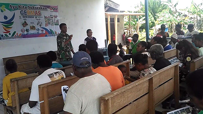 kampung Yarona Babinsa Serda Muslim bersama Masyarakat Kampung Yarona,mengikuti kegiatan Sosialisasi GERMAS(Gerakan Masyarakat Sehat ), yg di Sampikan oleh Suster Kristin/Nusantara Sehat tim dari puskesmas Distrik Buruway,Senin (10/09/2018).
