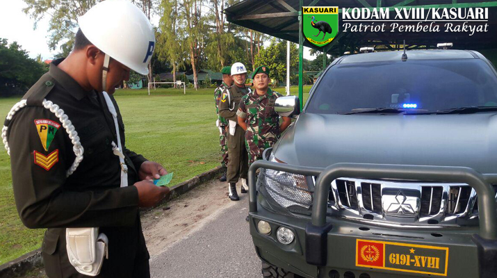 Sorong – Denpom Sorong bekerja sama dengan Team Intel dan Provost Korem 171/PVT melaksanakan Sweeping kendaraan dinas maupun pribadi kepada prajurit dan PNS jajaran Korem 171/PVT guna penegakkan tata tertib dan disiplin dijajaran prajurit dan PNS Korem 171/PVT, yang dipimpin oleh Kapten Cpm Ismail bertempat di Jalur Utama Pintu Masuk Korem 171/PVT Jl. Pramuka No. 1 Sorong -Papua Barat, Rabu (26/04/17).