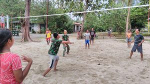 Makbon – Babinsa Koramil 1704-10/Makbon Sertu Edi Purnama dengan Serda Akmal, Serda Jois Noya melaksanakan olah raga bola volly bersama warga setempat lingkungan makoramil 1704-10/Makbon,…