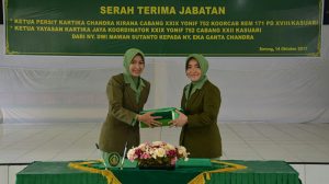 Sorong – Ketua Persit KCK Koorcabrem 171 Ny. Natalia Yogo Triyono, memimpin acara serah terima jabatan Ketua Persit Kartika Chandra Kirana Cabang XXIX Yonif 752…
