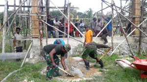 Inanwatan – Babinsa Koramil 1704-11/Inanwatan Kopda Donal Lopati bersama masyarakat dan panitia pembangunan gereja melaksanakan karya bakti memasang kawat pengecoran tiang Gereja bertempat di Kampung…