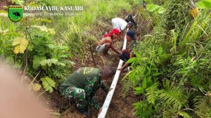 Bintuni – Babinsa Kampung Barma, Kopda Lasno bersama masyarakat melaksanakan kegiatan karya bakti pemasangan pipa air bersih di Kampung Barma Distrik Moskona Utara Kabupaten Teluk…
