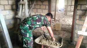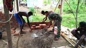 Sorong – Untuk mewujudkan kemanunggalan TNI Rakyat, Babinsa Koramil 1704-06/Salawati Kodim 1704/Sorong, Serda Mutadi melaksanakan gotong royong membantu warga memasang batu bata dalam pembanguan rumah…