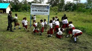 Manokwari – Guna menumbuhkan serta menanamkan rasa cinta kebersihan lingkungan dan rasa kebersamaan antara Anggota Koramil 1701-01/Manokwari dan keluarga besar Sekolah Dasar YPK Petrus Kafiar…