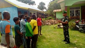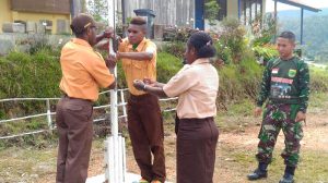 Kaimana – Bertempat di Distrik Kambrauw, Kab Kaimana, Babinsa Waho Serda Juanda beserta sertu Ronal wania mengajarkan Peraturan Baris Berbaris (PBB) kepada siswa dan siswi…