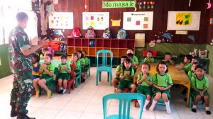 Sorong – Babinsa Klawalu Koramil 1704-01/Sorong Timur meluangkan waktu mendatangi TK Kartika VI-4 Yonif RK 752 demi menambahkan wawasan anak-anak yang masih berumuran 4 (Empat)…