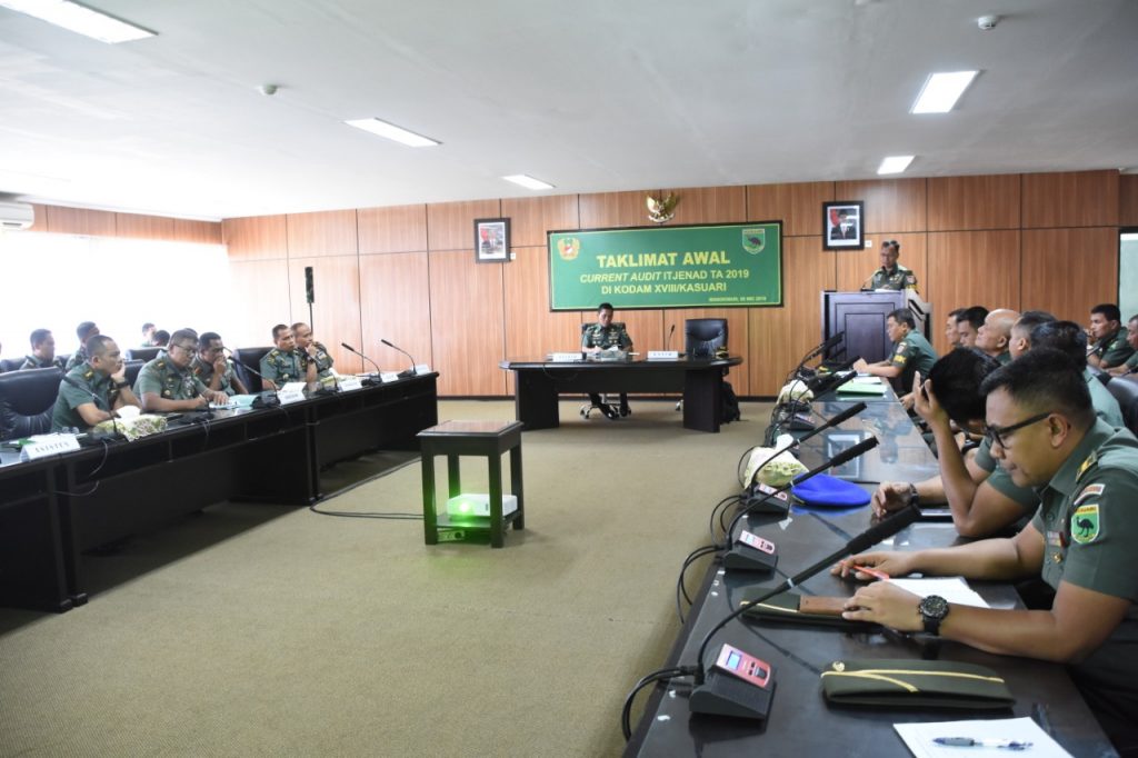 Manokwari – Rabu 08 Mei 2019 pukul 08.30 WIT digelar Taklimat Awal Pengawasan dan Pemeriksaan (Wasrik) Current Audit Itjenad TA. 2019 di Kodam XVIII/Kasuari dan Tim Wasrik Ijenad disambut oleh Kasdam XVIII/Kasuari Brigjen TNI H. Dedi Sambowo mewakili Pangdam XVIII/Kasuari. Tim Wasrik yaitu Kolonel Cpl Joko Prianto, Sos.,M.M beserta timnya dan turut hadir Danrem 181/PVT Brigjen TNI Ignatius Tri Joko, Irdam XVIII/Ksr, Danrindam XVIII/Ksr, para Asisten dan Kabalakdam XVIII/Ksr serta para Komandan Satuan jajaran Kodam XVIII/Ksr.