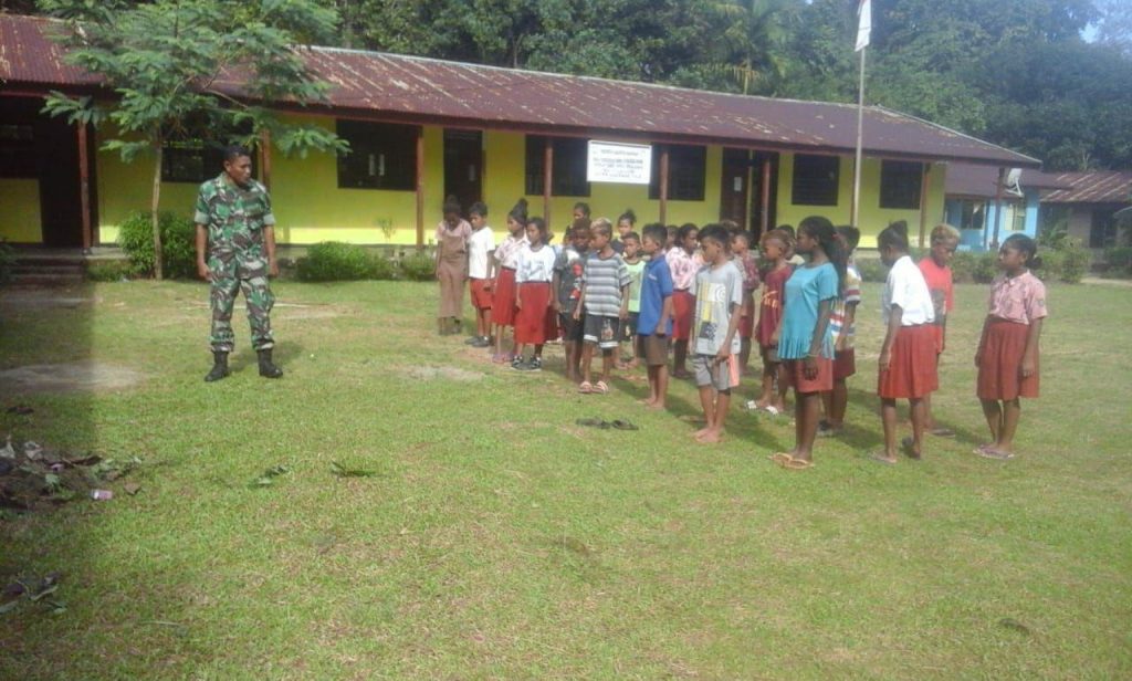 Manokwari – Bertempat di SD negeri Ayambori serda Abdul Syakur Babinsa koramil 1801-01/Manokwari  memberikan materi Wawasan Kebangsaan (Wasbang) dan gerakan dasar PBB  kepada siswa dan siswi SD negeri Ayambori distrik Manokwari Timur kabupaten Manokwari, Kamis (31/01/2019).