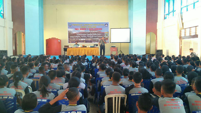 Sorong – Untuk menumbuhkan jiwa Nasionalisme bagi Siswa – siswi SMA Negeri 3 Kota Sorong, Danramil 1704-01/Sorong Timur Mayor Inf H. Triyana, S.Pd.I M.Pd.I memberikan materi Wawasan Kebangsaan (Wasbang) dan melatih memberikan Yel-yel guna meningkatkan semangat juang Siswa-siswi bertempat di Aula SMA Negeri 3 Kota Sorong, Sabtu (14/07/2018).