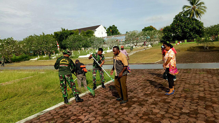 Manokwari – Sebagai wujud nyata jiwa Nasionalisme dapat dilakukan melalui berbagai cara dalam kehidupan sehari-hari, Seperti yang dilakukan oleh Babinsa Ramil 1703-01/Manokwari yang dipimpin Pelda D. Tukan beserta masyarakat sekitarnya melaksanakan Karya Bakti di Taman Makam Pahlawan, Manokwari, Jumat, (11/08/2017).
