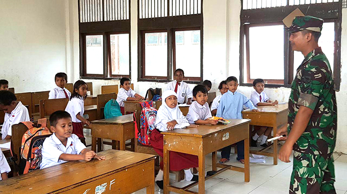 Sorong – Guna meningkatkan rasa cinta tanah air dan wawasan kebangsaan, Babinsa Koramil 1704-03/Saonek Sertu Komang Ari Gotama memberikan penyuluhan tentang Wawasan Kebangsaan (Wasbang) dengan materi 4 pilar kebangsaan, pengertian pancasila, kewajiban anak terhadap orang tua dan lagu kebangsaan Indonesia Raya pada siswa siswi SD Negeri 2 Raja Ampat yang dihadiri 30 siswa siswi di Kabupaten Raja Ampat, Selasa (14/11/17).