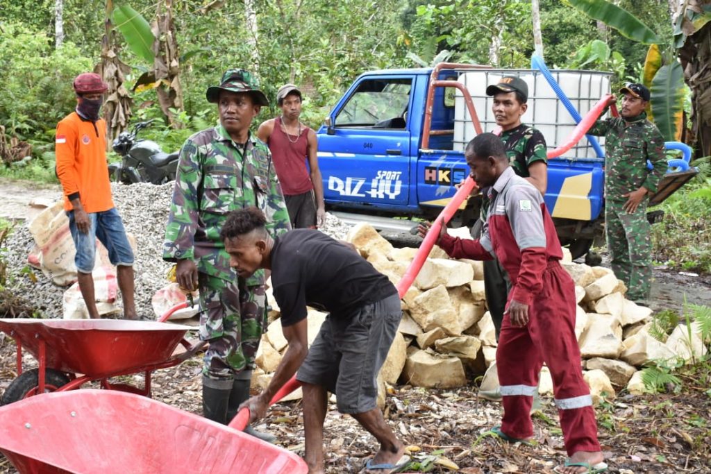 Demikian ungkapan dari Salis Tofir, Kepala Kampung Werpigan, saat menyaksikan warga kampungnya bersama para prajurit TNI bahu membahu melakukan pengecoran untuk membuat bak penampungan air, Senin (30/9/19) di Kampung Werpigan, Distrik Wartutin, Kabupaten Fakfak, Provinsi Papua Barat.