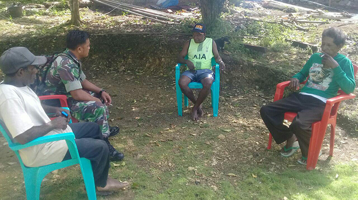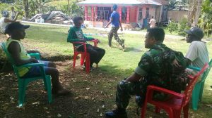 Sorong – Babinsa Koramil 1704-04/Teminauan jajaran Kodim 1704/Sorong Serda Rivo melaksanakan Komunikasi Sosial atau Komsos dengan Kepala Kampung Boldon, Distrik Wayer Teminabuan, Minggu (04/02/18).