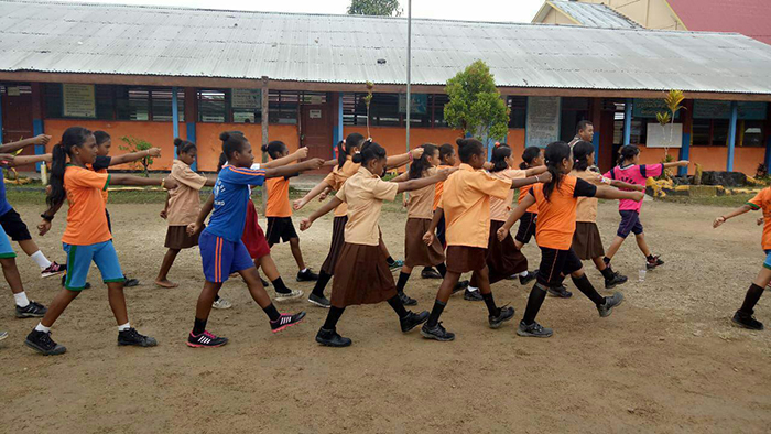 Sorong – Siswa siswi SD Negeri Mobi tampak serius dan berkonsentrasi mendengarkan instruksi dan aba-aba yang di berikan Sertu Alwi Babinsa Kampung Mobi dari Koramil 1704-04/Seget dalam latihan PBB yang di laksanakan di halaman sekolah tersebut, Jumat (12/10/2018).