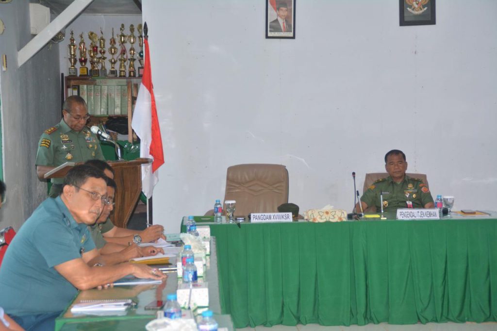 Sorong – Tim Wasrik Kemhan RI yang dipimpin Brigjen TNI Murlim Mariadi, S.I.P., M.M. telah melakukan pemeriksaan terhadap pemanfaatan dan Pengelolaan aset Barang Milik Negara (BMN) di jajaran Kodam XVIII/Kasuari TA. 2018 Kegiatan Tim Wasrik Kemhan RI di jajaran Kodam XVIII/Kasuari diakhiri dengan penyampaian Taklimat Akhir yang dipimpin langsung oleh Pangdam XVIII/Kasuari Mayjen TNI Joppye Onesimus Wayangkauw bertempat di Ruang Data Korem 171/PVT Sorong, Kegiatan ini juga dihadiri oleh Brigjen TNI Ignatius Yogo Triyono( Danrem 171/PVT ),Kol Frangky Riupassa ( Irdam XVIII/KSR ),Kol. Inf Hariyanto (Kasrem ),Kol Arh Eka Wahyudin (Kasiren),Kol Arm Hari Wibowo (Kasiter ),Para Dansat Dan Kabalak Jajaran Korem 171/PVT, Jumat (19/10/2018).