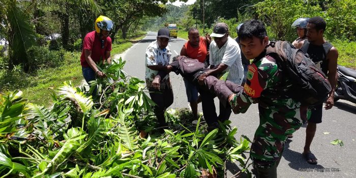 Babinsa Koramil 1801-05/Manokwari Utara Serda Yeri bersama masyarakat mengevakuasi pengendara sepeda motor yang tertimpa pohon tumbang di Jl amban pantai, manokwari barat, Kabupaten manokwari, Provinsi Papua Barat, Selasa (25/02/2025)