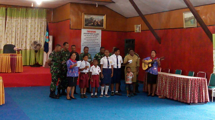 Sorong – Danramil 1704-10/Ayamaru Mayor Inf Andreas Pailo beserta Anggota dan keluarga yang beragama Nasrani melaksanakan ibadah bersama anggota Pemda dan warga Jemaat GKI Laharoi Ayamaru bertempat di aula Samubaa Ayamaru Distrik Ayamaru Kabupaten Maybrat. Senin (20/08/2018).