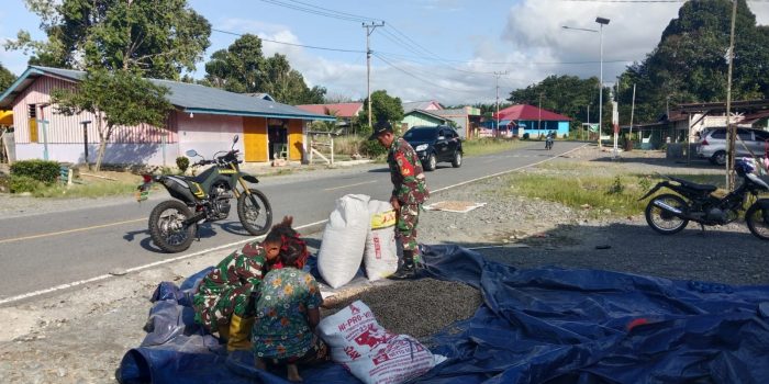 Sebagai wujud kemanunggalan TNI dan Rakyat, Sertu Bahrun dan Serda Ronal Maalete Babinsa koramil 1801-06/Sidey membantu Jemur kacang tanah salah satu warga di daerah binaan nya di kampung Wariki Distrik Sidey Kabupaten Manokwari, Provinsi Papua Barat, Sabtu (08/02/2025)