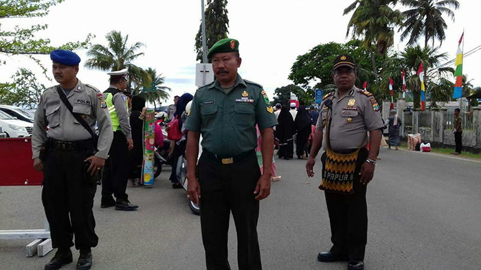 Sorong – Bertempat di Lapalangan Hoki Kelurahan Kampung Baru Distrik Sorong Kota Personel Koramil 1704-02/Sorong Barat dipimpin Serka Sudirman bersama anggota Polsek Sorong Kota dan dibantu oleh warga setempat melaksanakan Pengamanan Sholat Idul Adha 1439 H, Kamis (23/08/2018).