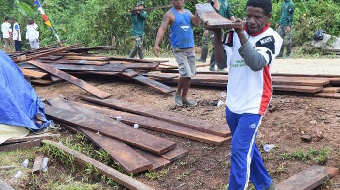 Sorong – Personel satuan tugas (Satgas) TMMD ke-101 Kodim 1704/Sorong berjuang membangkitkan semangat gotong royong dengan masyarakat kampung Sailala, Distrik Sayosa Timur – Kabupaten Sorong.