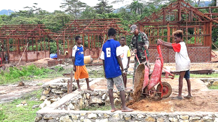 Sorong – Kegiatan TNI Manunggal Membangun Desa (TMMD) ke-101 Kodim 1704/Sorong bersama masyarakat melanjutkan pekerjaan sasaran fisik yang dimulai dari tahap pondasi dan penimbunan.
