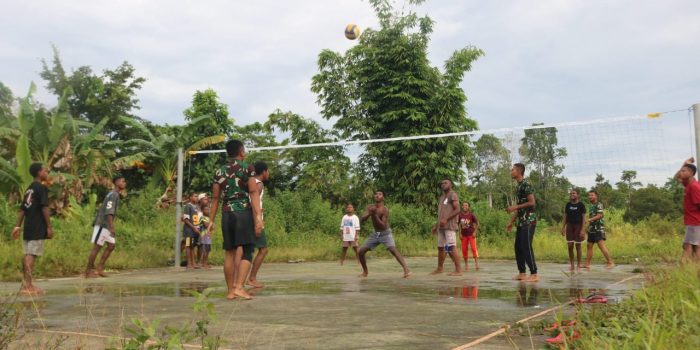 Satgas Tentara Manunggal Membangun Desa (TMMD) Ke-123 Kodim 1806/Teluk Bintuni bersama pemuda Kampung Riendo menggelar kegiatan olahraga voli di Lapangan Voli Balai Kampung Riendo, Distrik Farfurwar, Kabupaten Teluk Bintuni, Provinsi Papua Barat, pada Jumat, 28 Februari 2025.