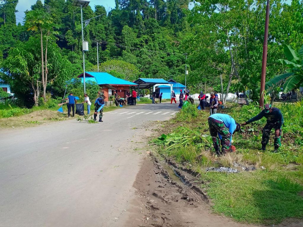 Raja Ampat – TNI bersama pegawai Distrik dan 4 Kelurahan di Kota Waisai membersihkan rumput dan sampah-sampah disepanjang Jl. Frans Kaisepo sampai dengan Jl. Lingkar Kimindores Kel. Sapordanco Distrik Kota Waisai, Kab. Raja Ampat, Provinsi Papua Barat yang diikuti ±100 orang, Kamis (24/1/2019).