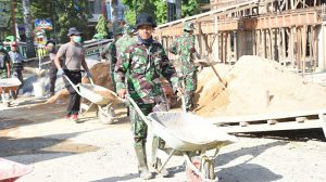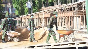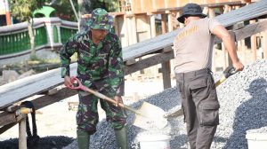 Warga bersama TNI-POLRI bergotong royong dalam kebersamaan demi pembangunan tempat ibadah yang mulia serta dapat menciptakan kehidupan dan pembangunan yang harmonis, aman dan kondusif serta bermanfaat bagi banyak pihak.