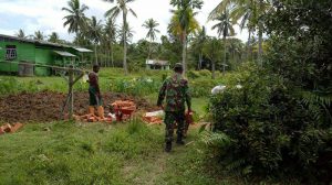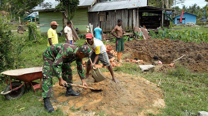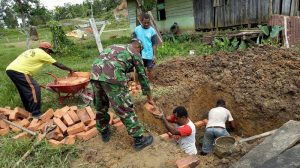 Sorong – Babinsa Koramil 1704-03/Salawati Kopda wahidin melaksanakan karya bakti pembuatan Jamban, tahap pembuatan sepiteng milik warga binaan Bapak Yacob Malakabu, bertempat di Kelurahan Katapop Pantai Distrik Salawati, Kamis (09/08/2018).