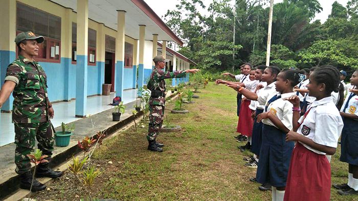 Sorong – Dalam rangka memberikan pemahaman tentang Pancasila, Babinsa Kampung Jeflio Distrik Mayamuk Koramil 1704-03/Salawati Sertu Muhtadi bersama Serda Adin Mulyadin mengajarkan tentang Wawasan Kebangsaan (Wasbang) kepada Murid Kelas 1 SMPN 20 Kabupaten Sorong, yaitu Materi Pancasila sebagai dasar negara Republik Indonesia, Kamis (19/07/2018).
