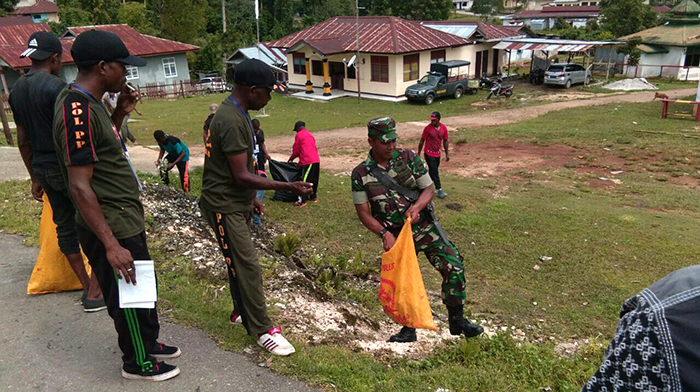 Sorong – Untuk menanamkan kepedulian kebersihan lingkungan terhadap masyakat. Kepedulian tersebut diwujudkan oleh Babinsa Ayamaru Koramil 1704-05/Ayamaru jajaran Kodim 1704/Sorong Serda Dedi Prishartanto dan Serda Eki yang bertugas sebagai Babinsa Ayamaru bersama kadistrik Ayamaru Demianus Lemauk dan Lurah Ayamaru Tonce Bles serta warga masyarakat dalam pelaksanaan karya bakti pembersian lingkungan perumahan dan perkantoran yang berada diwilayah distrik Ayamaru, Sabtu (09/12/17).