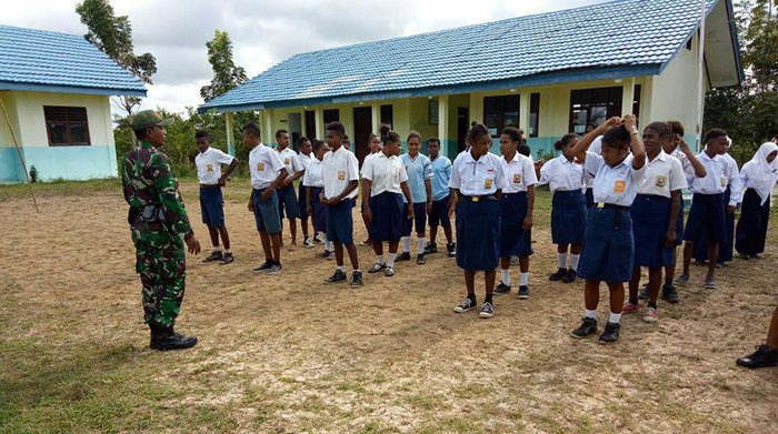 Sorong – Bertempat di SMPN 19 Kabupaten Sorong, Kelurahan Katimin, Distrik Salawati Babinsa Koramil 1704-03/Salawati Serda Wayan bersama Kopda Wahidin memberikan pelajaran pendidikan pembinaan karakter tentang Wawasan Kebangsaan (Wasbang), Rabu (15/08/2018).