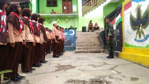 Fakfak – Babinsa Koramil 1706-01/Kota, Serka Erpan Nusantoro memberikan Wawasan Kebangsaan (Wasbang) tentang Bhineka Tunggal Ika, Pancasila dan tata cara Baris Berbaris kepada siswa siswi SMP As Salam Di Distrik Wagom, Kab. Fakfak, Senin (02/04/18)