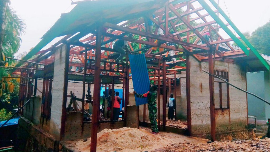 Fakfak – Babinsa Koramil 1803-01/Kota Serda Awaludin Wagab, Bersinergi dan bergotongroyong dengan Masyarakat Kampung Binaan dalam membantu memasang Atap Rumah (Seng) Rumah Warga Binaan Bapak Arsad Wagab, Bertempat di Kampung Pirma, Distrik Fakfak Tengah, Kabupaten Fakfak, Rabu (31/04/2019).