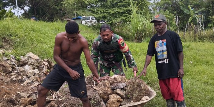Salawati – Wujud kepedulian Babinsa kepada warga Babinsa Koramil 1802-03/Salawati Sertu Piter melaksanakan karya bakti bersama warga binaan memindahkan batu pondasi dengan bergotong royong menggunakan alat gerobak bertempat di kampung Wen Distrik Mayamuk kabupaten sorong papua barat daya. Sabtu (1/02/2025).