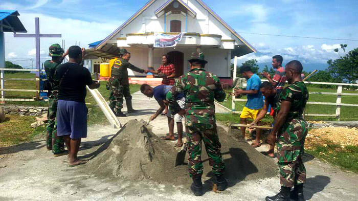 Manokwari – Danposramil Manokwari Timur Pelda Yanis bersama Babinsa Koramil 1703-01/Manokwari membantu masyarakat melaksanakan pembuatan pagar gereja dan pemberian bantuan berupa batu tela di Gereja Yohanis Susweni, Distrik Manokwari Timur, Kab. Manokwari, Prov. Papua Barat, Rabu (17/05/17).
