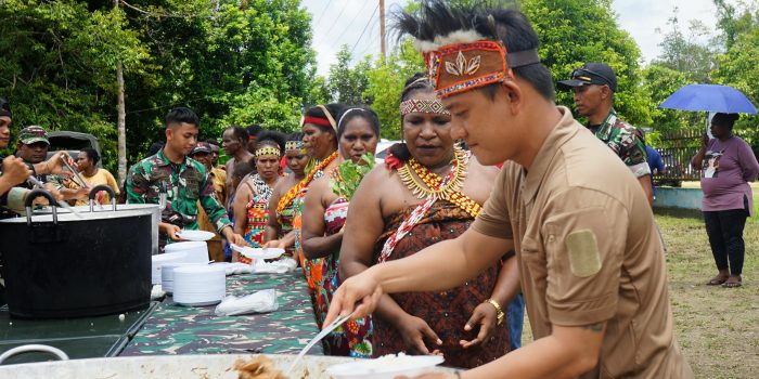 Wujud Nyata Sinergi TNI dan Masyarakat, Yonif 763/SBA berkolaborasi dengan Master Chef Bobon santoso laksanakan kegiatan “Kuali Merah Putih” di Distrik Tuhiba, Teluk Bintuni, Papua Barat(02/4/2024).