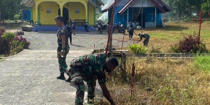 Manokwari. kodam18kasuari.tni-ad.mil.id – Batalyon Infanteri (Yonif) 761/Kibibor Akinting (KA), menggelar Karya Bakti (Karbak) di Desa binaan Kampung Duwin Distrik Warmare, Manokwari, Papua Barat, Sabtu (10/7/2021).